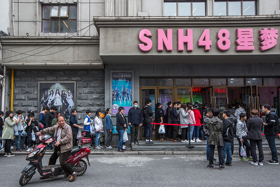 SNH48 fans line up in front of the theater in Shanghai to watch a special performance by the group. [Photo by Chen Zhongqiu/China Daily]