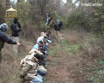 Meanwhile, gunmen rounded up two Sunni families that had received death threats for joining U.S.-organized talks with local Shiites, hauling away the men and boys and killing all six Saturday as suspected insurgents expanded a campaign of fear against opponents. U.S. forces also reported airstrikes and raids on what it called Sunni militant bases linked to al-Qaida in Iraq. A recent wave of Sunni reprisals appears linked to increasingly high-profile attempts to stir popular momentum against Sunni extremists trying to drive out the Shiite-led government and its American backers. Among those targeted include a range of Sunnis raising their voices against violence: imams, clan-based vigilantes and activists trying to bridge deep rifts with majority Shiites. The execution video released Saturday first depicts the 18 men, some in Iraqi military uniforms, blindfolded, hands tied behind their backs and lined up in three rows before a screen. The men in the front row are kneeling. Armed masked men were seen pointing machine guns at the captives. Two masked militants, with checkered scarves on their heads, then fire from handguns at close range into the backs of the men's heads, while a third militant carries a black banner ahead of them. As they are shot, the victims fall, head forward to the ground. The shooting is accompanied by chants of "Allahu Akbar," or "God is the Greatest." Male voices chant repeatedly in Arabic during the video: "At your service, sister" — a likely reference to the revenge for the allegedly raped Sunni woman. Another male voice is heard reading from the Islamic State of Iraq's statement posted on the same Web site Friday, saying the group's court had ordered the 18 security troops executed because Prime Minister Nouri al-Maliki's government had failed to meet the group's demands to hand over the officers who allegedly assaulted the Sunni woman in Baghdad last month, and to release all Sunni women detainees from Iraqi prisons.