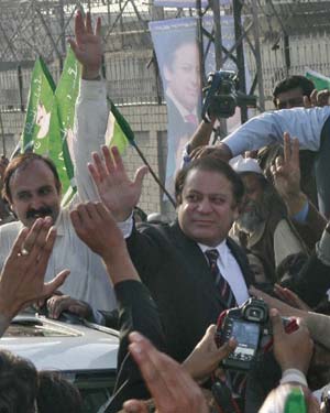 Pakistani opposition leader Nawaz Sharif waves to his supporters upon his arrival at Islamabad International Airport Islamabad Dec. 3, 2007.[Agencies]