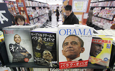 An English-language textbook, "The Speeches of Barack Obama," has sold more than 400,000 copies in two months, a big hit in a country where few hit novels sell more than a million copies a year. Japanese have a fervour for learning English and many bookstores have a corner dedicated to dozens of journals in the language, many of them now featuring the new US leader's face. "Speeches by presidents and presidential candidates are excellent as listening tools to learn English, because their contents are good and their words are easy to catch," said Yuzo Yamamoto of Asahi Press, which produced the best-selling text book. "Obama's is especially so. His speeches are so moving, and he also uses words such as 'yes, we can,' 'change' and 'hope' that even Japanese people can memorise," he said. Speeches by President George W. Bush and former nominee John Kerry's four years ago did not have the same appeal, however, and nor do those made by Japanese politicians, Yamamoto said. "In Japan, we don't have politicians who have such a positive influence. That's why we have to turn to a foreign president for someone in whom to place our hopes." The 95-page paperback features Obama's speeches in English from the 2004 Democratic National Convention and during the Democratic Party primaries, in which he defeated Hillary Clinton. They are accompanied by Japanese translations. The 1,050 yen (8 pound) book, which includes a CD of the speeches, tops the bestseller list on bookseller Amazon's Japanese Website, http://www.amazon.co.jp/