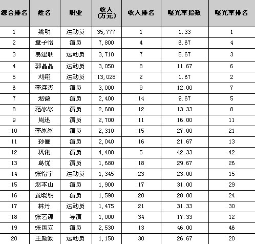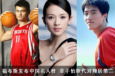 中國日報網(wǎng)中國在線消息:3月17日,《福布斯》中文版發(fā)布了“2009中國名人榜”。這是《福布斯》中文版連續(xù)第6年推出該榜單。小巨人姚明穩(wěn)居榜首。劉翔的綜合排名從去年的第2名滑落到今年的第5名。章子怡憑借《梅蘭芳》等作品和多個重量代言躍居榜單第2位。易建聯(lián)位居第三。