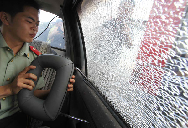 A firefighter shows how to use a removable headrest to smash a car window. After the devastating downpour in Beijing on July 21, an increasing number of people have decided to upgrade their survival skills. Provided to China Daily |