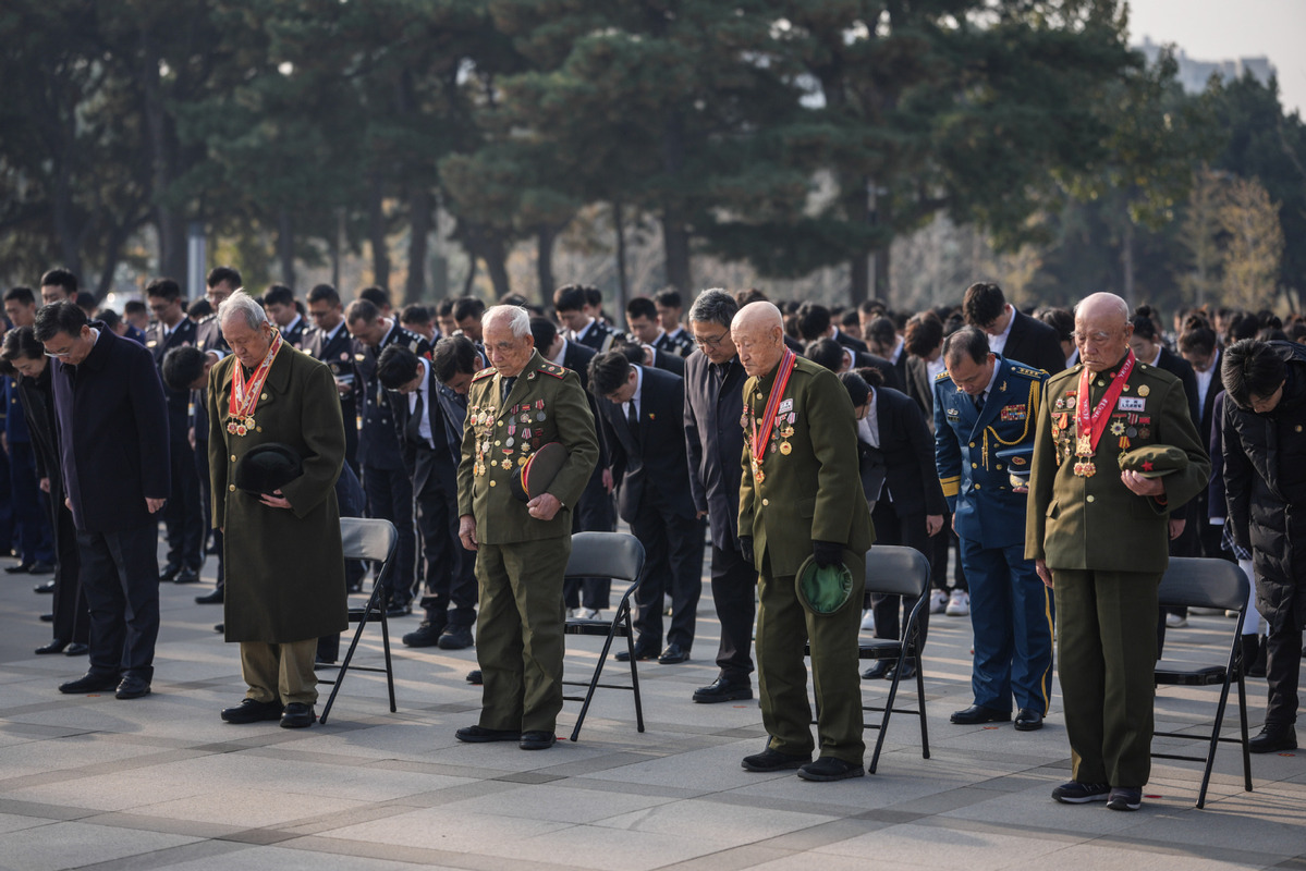 Chinese People's Volunteers (CPV) veterans observe a moment of silence during a flower basket presenting ceremony at the CPV martyrs' cemetery in Shenyang, Northeast China's Liaoning province, Oct 25, 2025. [Photo/Xinhua]