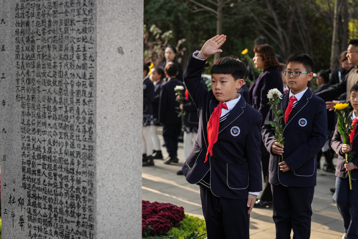 Students pay tribute to martyrs of the Chinese People's Volunteers (CPV) at the CPV martyrs' cemetery in Shenyang, Northeast China's Liaoning province, Oct 25, 2025. [Photo/Xinhua]