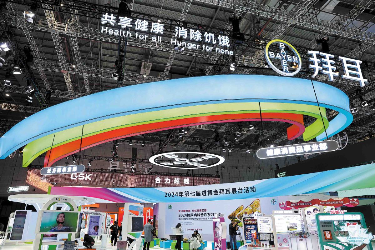 Visitors check out products at German life sciences company Bayer's exhibition stand during the 7th China International Import Expo in Shanghai on Nov 5, 2024. CHINA DAILY