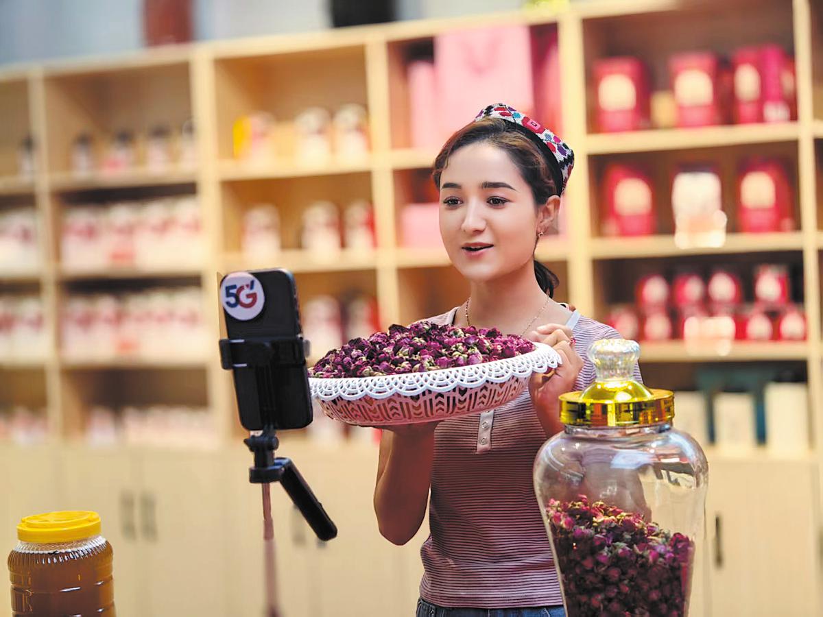 Rukiyam Ujabulla promotes roses grown by her family business in Yutian, Xinjiang Uygur autonomous region, in July. FAN QIONGYAN/FOR CHINA DAILY