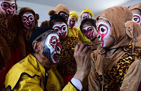Jia Bing jumps down from a platform after she painted a mural in Xi'an, Shaanxi province, Dec 22 2015. Jia is a self-employed painter who once worked at a cartoon company. The post-80s artist grew tired of working there and left the cartoon company after three years in 2013. [Photo/CFP]