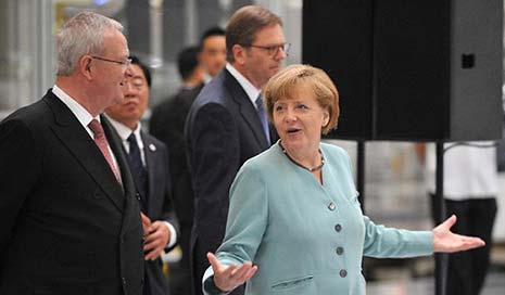 German Chancellor Angela Merkel (C) visits the branch company of FAW-Volkswagen in Chengdu, capital of Southwest China's Sichuan province, July 6, 2014. [Photo/Xinhua] |