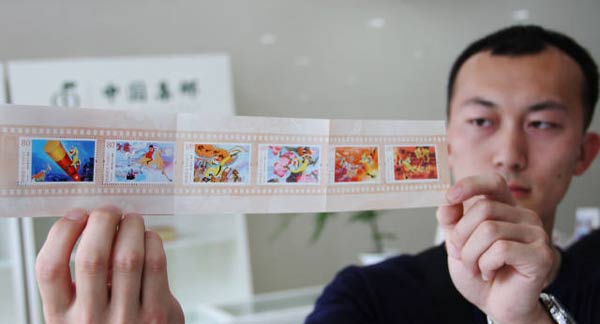 A man shows Monkey Kinglimited editionstamps that use AR technologies. The series are China’s first AR stamps issued by China Post in 2014. [Photo/Xinhua]