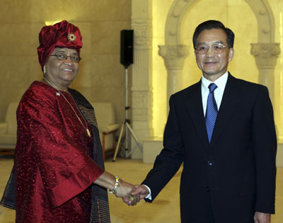 Chinese Premier Wen Jiabao (R) shakes hands with Liberia's