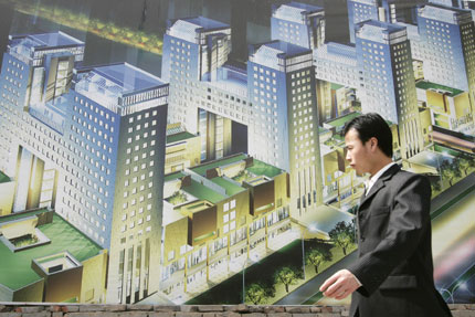 A man walks past a billboard for a new property development being erected in Beijing April 24, 2006. The central bank is to raise the reserve ratio of the commercial banks by 0.5 percentage points to 11% in a bid to cool the investment boom. [Reuters]