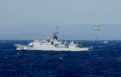 A French naval helicopter closes in on a Chinese vessel to rescue the "injured" soldiers during the first joint naval exercise between China and France, code-named "China-France Friendship 2007", in the Mediterranean Sea on September 25, 2007. [Xinhua]