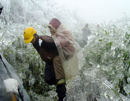A rescuer carries an 80-year-old woman out of Jinlian village in Longnan county, East China's Jiangxi Province, Feb. 3, 2008. After being trapped for days in frozen weather and without electricity and water supply, 1,761 people in the village were rescued successfully on Sunday. [Xinhua]