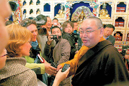 Jamyang Losang Jigme Tubdain Qoigyi Nyima, a living Buddha of the Labrang Lamasery, received interviews during a recent media tour to the Gansu Province. [China Daily]
