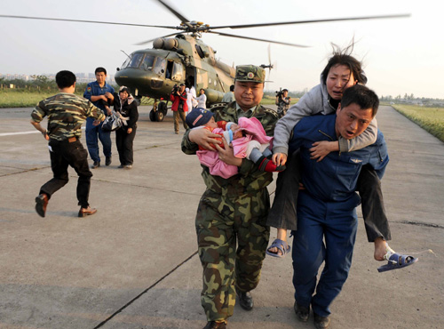 Soldiers carry those injured from the earthquake from a military helicopter that transported them to Chengdu, capital of Southwest China's Sichuan Province, May 14, 2008. [Xinhua]