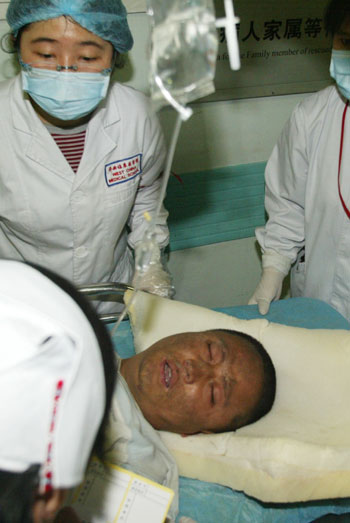 A man seriously injured in Monday's deadly earthquake is treated at Huaxi Hospital in Chengdu, Sichuan Province May 14, 2008 after being airlifted to the hospital from Wenchuan. 162 persons seriously injured in Wenchuan were airlifted to Chengdu on Wednesday. [Xinhua]