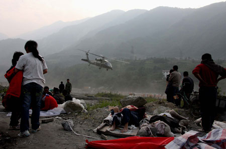 A military helicopter transports emergency relief materials to Yingxiu Town of Wenchuan County, Southwest China's Sichuan Province, May 15, 2008. Yingxiu Town is one of the worst-hit towns in Monday's earthquake. [Xinhua]