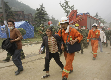 Rescue workers help to evacuate residents to higher ground from the centre of earthquake-hit Beichuan county, Sichuan province, May 17, 2008. Beichuan county near the epicentre of a 7.8-magnitude earthquake was ordered to evacuate immediately Saturday from areas around a lake that is rising rapidly and may burst at any time.. [Agencies]