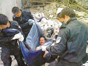 An 80-year-old partially paralysed man is rescued in Mianzhu city of Sichuan Province 266 hours after the May 12 earthquake, on Friday. [Jiefang Daily]