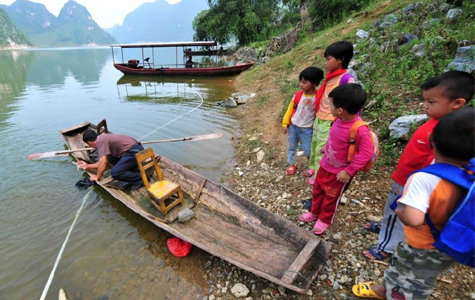 | A teacher and his boat During 25 years of teaching, Shi Lansong has been taking his students to and from school on his wooden boat across a 2-kilometer-wide lake in a village in South China's Guangxi Zhuang autonomous region. He has gone through eight boats. Shi said he will continue doing this for the next 15 years, until he retires. |