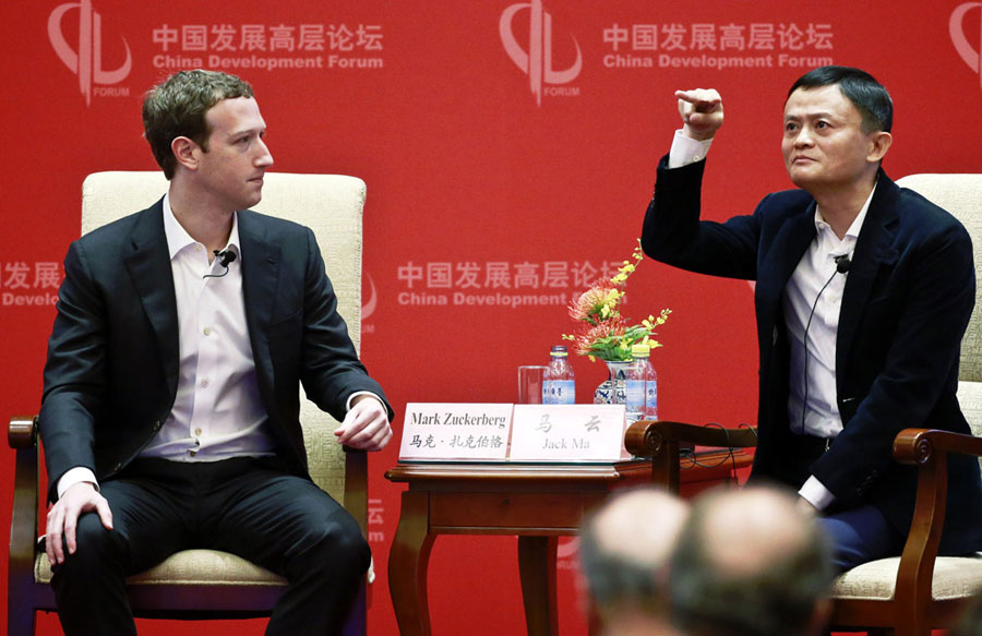 Mark Zuckerberg, CEO of Facebook, talks with Jack Ma, chairman of Alibaba Group Holding Ltd at the China Development Forum in Beijing on March 19, 2016. [Photo by Feng Yongbin/chinadaily.com.cn]