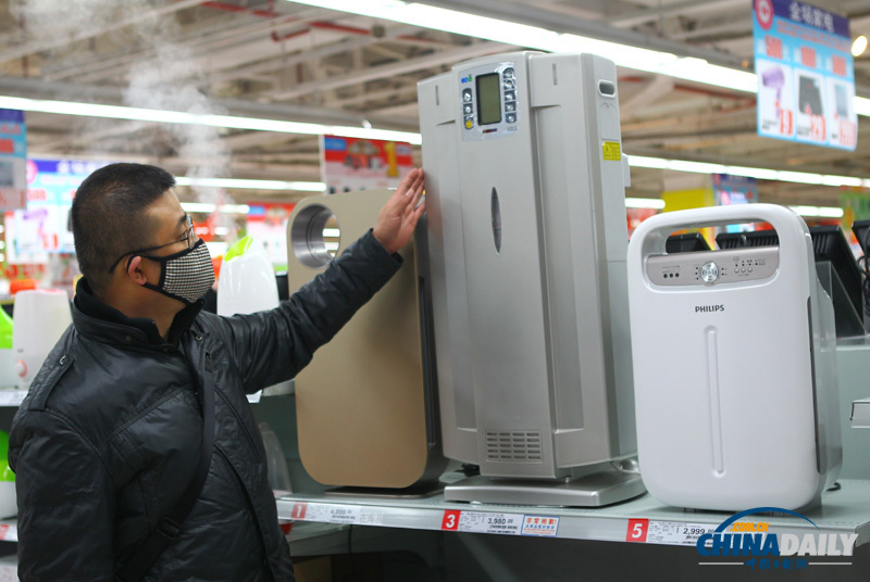 2013年1月13日,顧客張鳳泉戴著口罩在北京家樂福國展店挑選空氣凈化器。 鄒紅 攝