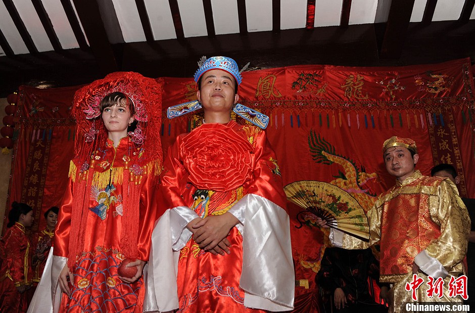 5月23日,重慶洋人街上敲鑼打鼓抬轎迎親的隊(duì)伍吸引不少游客觀看。鳴鑼開到、起轎迎親,新郎身穿中式服裝騎著馬,以中式婚禮的方式進(jìn)行迎親儀式。新郎是重慶本地小伙,新娘是白俄羅斯人,相互相識已有八年時間,兩人穿著中式服裝進(jìn)行了拜堂儀式結(jié)為夫妻。