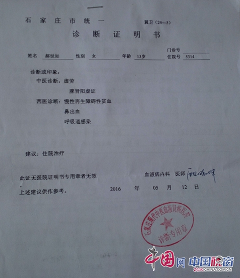 據(jù)了解,鄭建英有一個(gè)13歲的女兒,本正是花季的年齡的她,在2013年2月份查出再生障礙性貧血。從查出患病的那刻,鄭建英帶著女兒開始了四處奔波求醫(yī)的旅程。