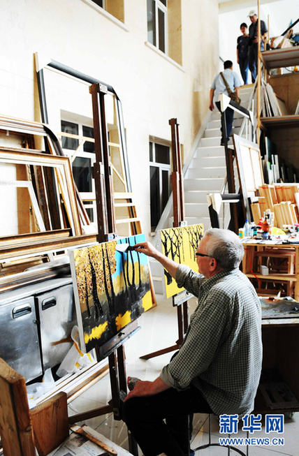 5月27日,在太陽(yáng)島上的俄羅斯畫(huà)家村,俄羅斯油畫(huà)家別達(dá)·阿列克謝在進(jìn)行油畫(huà)創(chuàng)作?!⌒氯A社記者王建威 攝
