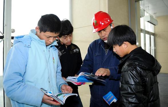 新華社照片,長春,2013年2月1日 保孤兒用電安全長春城郊供電分公司的配電工向孤兒學(xué)校的學(xué)生發(fā)放安全用電手冊(1月31日攝)。 1月31日,國家電網(wǎng)長春城郊供電分公司的配電工來到吉林省孤兒學(xué)校,對學(xué)校的配電線路進(jìn)行巡檢,對有隱患的線路進(jìn)行維修和調(diào)整。配電工人還向孤兒學(xué)校的學(xué)生發(fā)放安全用電手冊,叮囑他們在節(jié)日期間注意用電安全。新華社記者許暢 攝