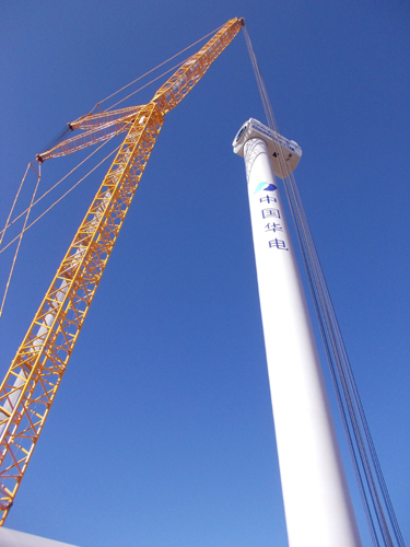 說(shuō)到這兒,也許有人會(huì)問(wèn):什么是兆瓦?兆瓦是電量計(jì)算單位,通常是以“MW”表示。大家知道,1度電是1000瓦?時(shí),1000千瓦就是1兆瓦。那么5兆瓦就是說(shuō)該風(fēng)電機(jī)組每小時(shí)發(fā)電可達(dá)5000千瓦。一臺(tái)機(jī)組年發(fā)電量可滿足一萬(wàn)個(gè)家庭全年的用電需求。在吊裝現(xiàn)場(chǎng),離很遠(yuǎn)就可見(jiàn)高高聳立的銀白色“立柱”?!斑@叫塔筒,到上面參觀一下吧?!币晃幻欣罱艿哪贻p技術(shù)員領(lǐng)著記者來(lái)到塔筒跟前。嘿,真大!塔筒高95米,底部直徑就有6米,走上扶梯從敞開(kāi)的鐵門進(jìn)去,里面別有洞天:變壓器、變頻器、開(kāi)關(guān)柜、環(huán)網(wǎng)柜、水冷泵…… 一應(yīng)俱全。小李手指扶梯:“從這里爬上去,到10米高處,就能乘電梯直通塔頂?!薄斑@么高的塔筒萬(wàn)一被大風(fēng)吹倒了怎么辦?”也許是記者的問(wèn)題顯得有些天真,小李忍不住笑道:“別擔(dān)心,塔筒埋在地底下5米,和鋼筋混凝土基礎(chǔ)牢牢融為一體,結(jié)實(shí)著呢!”緊靠塔筒的地面,有一長(zhǎng)方形巨大的箱狀物體,“這就是我們今天要首先吊裝的發(fā)電機(jī)組的機(jī)艙,它的重量達(dá)248噸,相當(dāng)于124輛越野車的重量?!?吊裝工程總指揮李毅鵬道。記者一看,可不是嗎,機(jī)艙的攔腰處還懸掛著一幅藍(lán)底白字的醒目標(biāo)語(yǔ):“祝國(guó)內(nèi)首臺(tái)高海拔5兆瓦發(fā)電機(jī)組順利竣工?!本嚯x工地70米處有3個(gè)好像飛機(jī)翅膀一樣的東西,但比飛機(jī)翅膀要長(zhǎng)的多。莫非這就是發(fā)電機(jī)組的葉片?“是的,每根葉片長(zhǎng)62米,葉輪直徑有128米”。看到記者驚訝的表情,李毅鵬說(shuō):“和國(guó)內(nèi)同類型產(chǎn)品相比,太重風(fēng)機(jī)整機(jī)重量輕,度電成本低,電網(wǎng)適應(yīng)性好,具有適應(yīng)極低溫、高海拔、大湍流風(fēng)場(chǎng)等特點(diǎn),同時(shí)具備海陸兩用功能。”