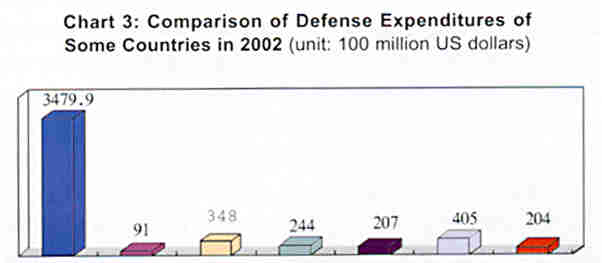 The increased defense expenditure in recent years has primarily been for the following purposes: ①Increase of personnel expenses. Along with the socio-economic development and the per-capita income rise of rural and urban residents, it is necessary to improve the living standards and conditions of military personnel. The past decade has witnessed the increase of the board expenses in the armed forces on five occasions, and an 84% salary raise for officers and 92% allowance raise for soldiers. ②Establishment and gradual improvement of a social security system for servicemen. In accordance with the requirements of the market economy, China has, since 1998, established such systems as injury and death insurance for servicemen, medical insurance for demobilized servicemen and housing subsidies for servicemen, and adjusted and enhanced living expense standards for PLA retirees. ③Increase of expenses of a maintenance nature. Since the armed forces stopped commercial activities in 1998, the budget for training has increased year by year. With the gradual improvement of living facilities and progressive office automation, expenses of a maintenance nature have kept rising. ④Increase of expenses spent on cooperation with the international community in anti-terrorism activities. 5.Appropriate increase of expenses for the improvement of military equipment to enhance defense capabilities under the conditions of modern technologies, particularly high technologies. On the whole, China's defense expenditure has remained at a fairly low level in the world in 2002 (see Chart 3). Compared with the USA, Russia, UK and France, the percentage of China's defense expenditure in its GDP and the state financial expenditure is also fairly low (see Chart 4).