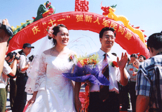 | | |  | | | Liu Chunlin (R), a doctor with the Shenyan Military Area Command, and Li Mingrui receive people's greetings during a group wedding ceremony for eight newlyweds on July 1, 2003, in Dalian, Northeast China's Liaoning Province. The eight couples postponed their marriage to help Beijing's fight against SARS in Xiaotangshan hospital. [newsphoto.com.cn]