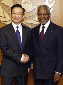 He gave the warning on two occasions -- a meeting with United Nations Secretary-General Kofi Annan and talking with groups of overseas Chinese. Annan emphasized that the United Nations maintains a one-China policy, but that differences need to be settled without "any resort to violence.'' Wen stressed: "As long as there is still a glimmer of hope, the Chinese Government will not give up its efforts for a peaceful unification and a peaceful settlement.'' He emphasized that the use of force does not target the Taiwan people, but those who wish to separate Taiwan from the motherland. "No interest is higher than that of maintaining national reunification,'' said Wen in a speech to overseas Chinese representatives. Wen, who arrived in New York on Sunday on the first leg of the four-day visit to US, took the opportunity here to have wide contacts with leaders of business circles to highlight the desire for closer economic and trade partnerships. He rang the opening bell at the New York Stock Exchange, held talks with some well-known US experts on such topics as bilateral trade relations and the value of the Chinese currency, delivered a key-note speech to business leaders Monday and will later visit the General Electric Company. The Chinese Premier also toured the site where the World Trade Centre was demolished in the September 11 attacks and laid a wreath there. The two countries have stepped up their anti-terrorist co-operation and bilateral ties have improved steadily since. Wen outlined China's economic policy towards the US in his speech entitled "Work Together to Open a New Chapter in China-US Trade and Economic Co-operation,'' which was made at a luncheon hosted by the American Bankers Association. He said the thriving bilateral economic partnership has contributed greatly to the prosperity of the surrounding areas and to world economic growth. The reason for such rapid growth of economic co-operation lies in the "high degree of complementarity of the two economies,'' according to Wen. The scholarly Premier, who usually prefers to use poems to express his feelings, Monday quoted a famous Chinese poem to encourage business leaders and politicians to give proper attention to problems between the two countries. Depicting how climbers of the towering Mount Tai feel, an ancient Chinese poem goes, "I must ascend the mountain's crest; it dwarfs all peaks under my feet.'' "When approaching problems in China-US trade, we also need to take a strategic perspective of vision and foresight,'' said Wen. Problems such as the US trade deficit with China, the renminbi exchange rate, and Intellectual Property Rights (IPR) protection, concern many people in the US. But they are also problems that come along with expanded China-US trade, and they can be ironed out gradually since common understanding on them is entirely obtainable, Wen said. "They should not, and will not, stand in the way of the larger interests of China-US trade. As whirlpools are sometimes found in a surging river, the flows of history can also be interrupted by some occasional setbacks,'' Wen added. Nation opposes deficit increase He said China does not want an increase in the US trade deficit with China, but reducing Chinese exports to the US is not the answer, as doing so serves neither China nor the US in solving its unemployment problem. Instead, it will seriously harm the interests of millions of US consumers and US firms operating in China. "A more realistic solution is for the US to expand its exports to China,'' said Wen. He also said that China will substantially increase imports of farm products and machinery from the US, and place more purchasing orders for American commodities. " At the same time, we hope the US will recognize China's market economy status, and lift its export restrictions on high-tech products,'' Wen added. He predicted that by the year 2020, China's gross domestic products will reach US$4 trillion and in the next three years, China's volume of imports will surpass US$1 trillion, which will provide a huge number of business opportunities. The Premier said he plans to make a proposal to President Bush to raise the level of the Joint Commission on Commerce and Trade, so as to better serve bilateral trade and economic co-operation. The two leaders are expected to hold talks in the White House on Tuesday local time. Wen said China's development relies mainly on domestic demand and does not seek long-standing, excessive trade surplus. He then quoted a famous US saying to encourage business leaders to promote bilateral economic and trade ties: "The golden age is before us, not behind us.''