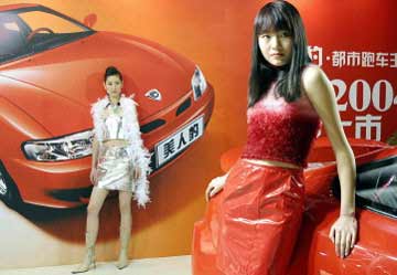 Chinese models pose in a newly opened auto showroom in Beijing. China has started slashing its average import tariff rate to 10.4 percent from the current 11 percent.