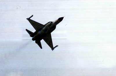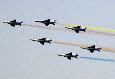 An air show is staged at Nanyuan Airport in the southern suburbs of Beijing November 3, 2003, as part of an air show organized to commemorate the centennial anniversary of aviation for human beings. The pilots performed two dozen flight manoeuvres in a half-hour stunt show, dazzling 11,000 viewers with spectacular acrobatic performances. [Xinhua]