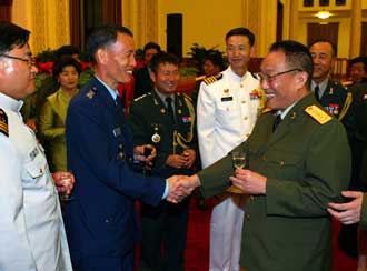 Chinese Defence Minister General Cao Gangchuan (Left) toasts with Walter F.Ballen Pena (Right), military attache of Peru Embassy in China, in a reception held yesterday at the Great Hall of the People in Beijing by the Ministry of Defence, to celebrate the 76th anniversary of the founding of the Chinese People's Liberation Army (PLA), which falls on August 1. [newsphtoto.com.cn]