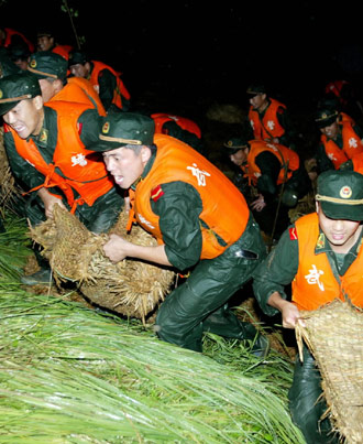 The valiant efforts of armed police who repaired a collapsing dyke in East China on the evening of July 8, 2003, saved more than 1 million people at risk from serious flooding. The collapsed dyke on the Chuhe River, which flows across Anhui and Jiangsu provinces, threatened the Beijing-Shanghai railway artery and Nanjing, capital of Jiangsu Province, 50 kilometres away, said officials with the Anhui flood control department. [newsphoto.com.cn]