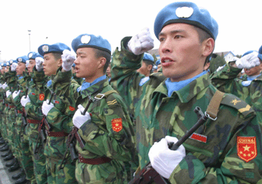 Chinese peacekeepers wait for march order in Beijing Capital International Airport on April 1, 2003. They are heading for the Democratic Republic of Congo for a peacekeeping mission. [newsphoto.com.cn]