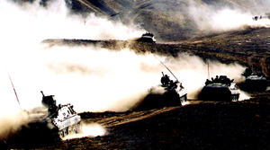 In the light of the special features of future war, an armored regiment of the Xinjiang Military Command actively explore the new training methods and combat skills with the aim of improving the troops' scramble capability, field survival capability and accompanying support capability. The picture shows the troops are conducting maneuver training. [PLA Daily]