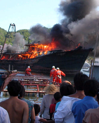 Onlookers watch firemen trying to put out fierce fire which broke out in two big fishing boats anchored for repair and maintenance in Sanya, a port in southern China's Hainan Province. The fire was the result of an electrical fault and lasted for more than one hour, causing damage of at least 3 million yuan (US$360,000). [newsphoto.com.cn]
