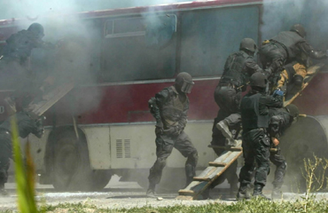 Soliders storm a bus "hijacked" by "terrorists" in the second phase of the Shanghai Cooperation Organization (SCO)'s joint military exercise in Yili, Northwest China's Xinjiang Uygur Autonomous Region August 11, 2003. More than 1,000 officers and soldiers from SCO's five member states, including China and Russia, take part in the anti-terrorism maneuver. The first phase of the drill was held in Kazakhstan's border city of Ucharal.[Xinhua]
