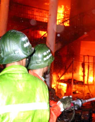 Firefighters try to quell fierce flames in a wholesale small-commodities market in Shiyan, Central China's Hebei Province July 8, 2003. Several hundred wholesalers' properties were reduced to ashes and seven firefighters were injured. The cause of the fire is under investigation. [newsphoto.com.cn]