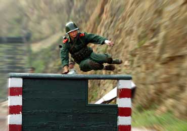 A soldier from the Zhejiang Unit of the Armed Police jumps over a wall in an anti-terror exercise in Hangzhou, East China's Zhejiang Province on July 9, 2003. [newsphoto.com.cn]