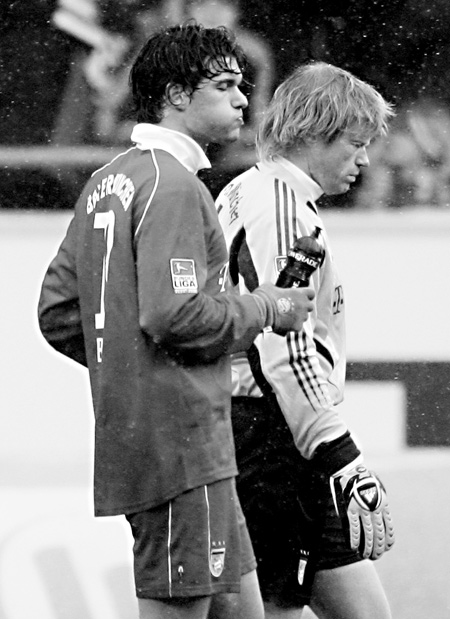 Michael Ballack and Oliver Kahn (right) leave the field after their German Bundesliga match against Wolfsburg in Wolfsburg last week. The match ended in a 0-0 draw. Head coach Felix Magath, whose team have earned only one point from their last two league games and are out of the Champions League, says the German champions have a perfect opportunity to prove a point when they entertain third-placed Schalke 04 in the Bundesliga on Sunday. (Reuters)
