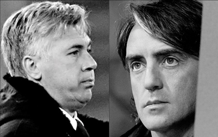 The race for second place between Inter Milan and AC Milan in Itailian Serie A heats up when Roberto Mancini (right)'s Inter host Lazio and Carlo Ancelotti's AC Milan play Udinese away on Sunday. (Reuters/AfP)