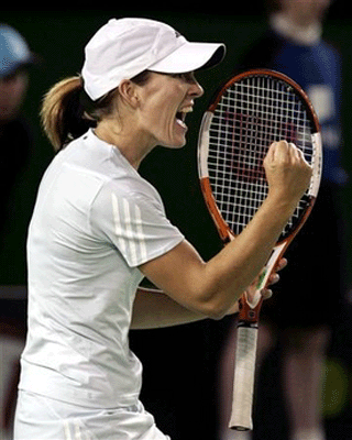 Henin-Hardenne of Belgium reacts after defeating Lindsay Davenport of the
