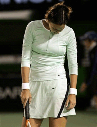 of the U.S. reacts during her match against Justine Henin-Hardenne of