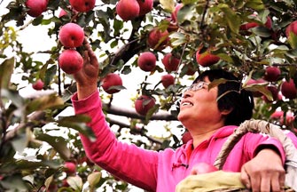 A villager packs apples in her orchard in Badaling township in Yanqing district of Beijing, capital of China.