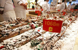 The world's longest Christmas cake, a 1,068 meter-long vanilla flavored log with a bitter chocolate cover, is displayed at a hotel in Shanghai on Thursday.